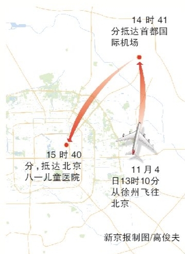 11月4日上午9时许,孙一贺、孙一畅兄弟俩从淮北市妇幼保健院出发,乘救护车前往徐州观音机场,准备前往北京继续治疗。13时10分左右,双胞胎在徐州观音机场乘坐医疗专机ICU506号航班飞往北京。