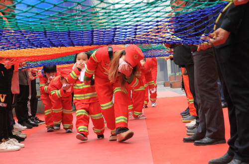商户们用手拉起逃生网,小朋友们在家长带领下迅速用湿毛巾捂住口鼻,弯下腰,排成一排,有序的从攀爬网通过,并迅速的钻过隧道桶。