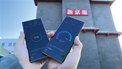 在位于东城区的新京报社,下载一款大型游戏(约1.6G),5G手机用了大概15秒就下载完毕,而4G手机的进度条才走到5%。