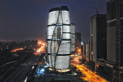 丽泽SOHO外立面设计为鱼鳞式幕墙,由4000多块异形单元体玻璃构成。亮灯之后,整个建筑在夜幕中宛如明亮的眼睛。A08-A09版摄影/新京报记者 王嘉宁 陶冉