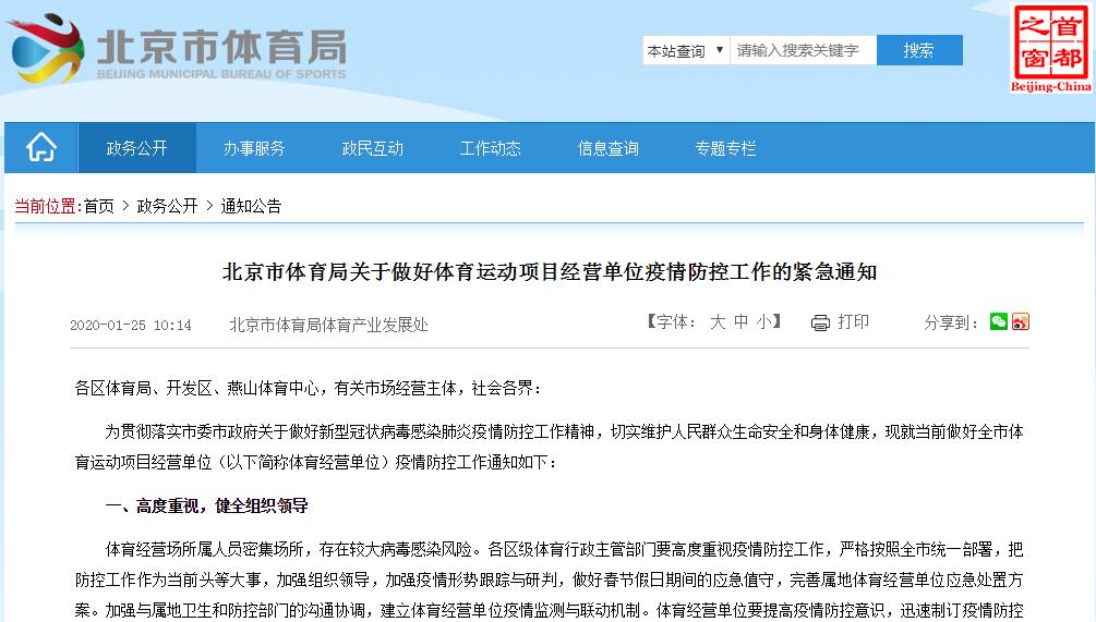 体育经营场所属人员密集场所,存在较大病毒感染风险。各区级体育行政主管部门要高度重视疫情防控工作,严格按照全市统一部署,把防控工作作为当前头等大事,加强组织领导,加强疫情形势跟踪与研判,做好春节假日期间的应急值守,完善属地体育经营单位应急处置方案。加强与属地卫生和防控部门的沟通协调,建立体育经营单位疫情监测与联动机制。体育经营单位要提高疫情防控意识,迅速制订疫情防控工作方案,并组织有效实施。