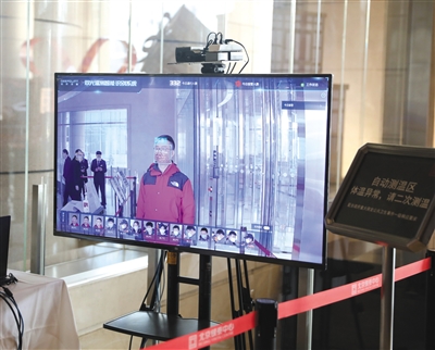 昨日(23日)下午,北京银泰中心C座写字楼,企业复工人员需要经过手持测温枪和智能识别系统两次测温,并实名登记,才能进入写字楼。电梯口还张贴有告示,提示不要超过四个人乘坐。据相关负责人介绍,写字楼内的空调系统配备紫外线消毒、过滤网除尘等设施,可有效消灭空气循环中的病菌。新京报记者 王飞 沙雪良 摄影报道