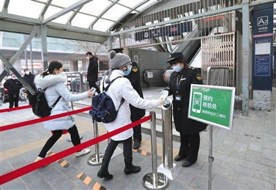 昨日(6日),北京地铁昌平线沙河站A2口,提前预约的乘客扫描二维码后走专用通道进站乘车。从当日起,北京地铁在5号线天通苑站、昌平线沙河站试点工作日早高峰预约进站。乘客在约定时间段到达车站,走预约专用通道,可以不用排长队安检进站。记者实地测试后发现,首次线上注册、申请地铁预约进站用时不会超过2分钟,现场二维码验证时间仅需1秒钟。新京报记者 王贵彬 裴剑飞 摄影报道