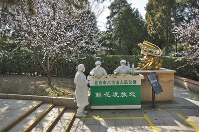 昨天早上,记者前往八宝山革命公墓。位于石景山路的公墓南门入口关闭,门口指示牌提示今年预约清明祭扫需由西三门进入。早上不到七点,核验检测的工作人员已穿好防护服,佩戴着口罩、护目镜,全部到位。