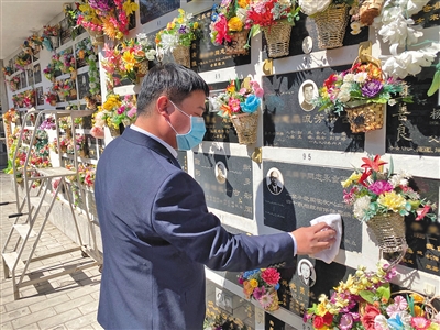 3月31日,八宝山革命公墓的工作人员在骨灰墙进行代祭服务。八宝山革命公墓供图