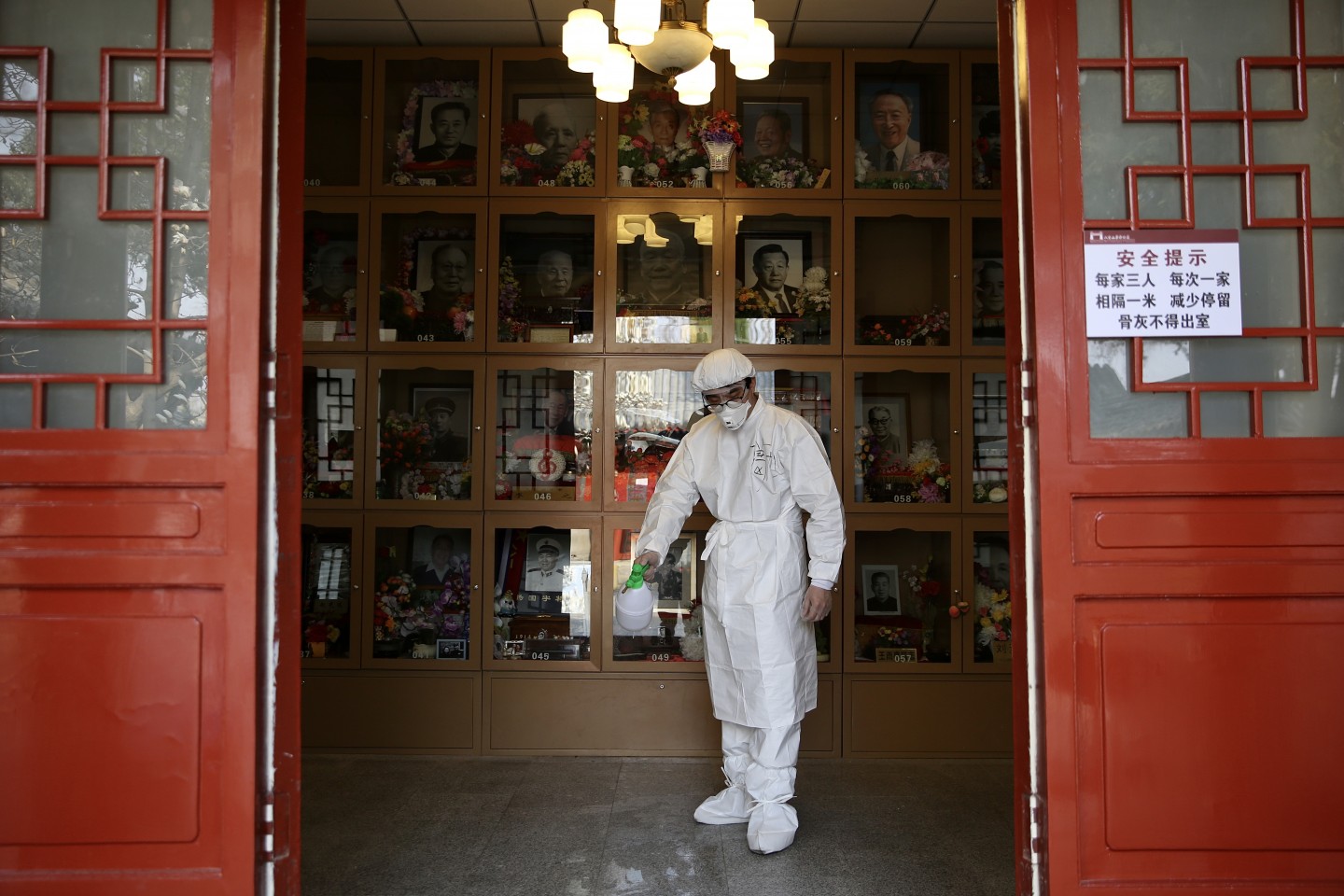 3月21日,八宝山革命公墓骨灰堂内,工作人员进行消杀。记者 郑新洽 摄
