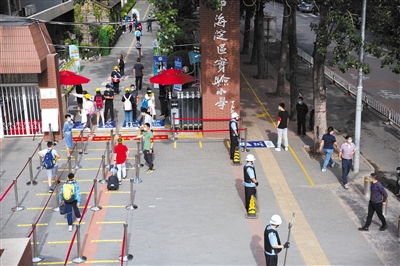 新京报讯 昨日,北京市高一、高二、初一、初二以及小学六年级开学,全市40万余中小学生正式返校。复课后,进校体温监测是学生进入校园的标配。随着天气逐渐转热,记者注意到,各校校门口都已设了观察点。如果因为天气或是走得太急等因素,入校前体温异常,会有老师引导,让学生稍微休息一下再测温避免误判。