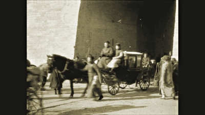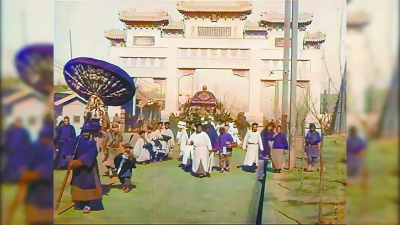 ▲1908年,大户人家(带大型棺罩)的出殡队伍穿过克林德牌坊。上色视频截图