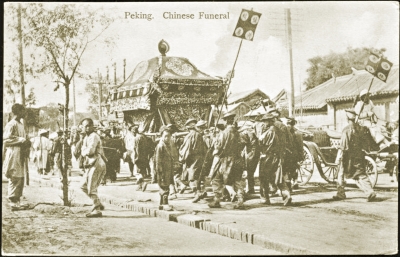 ▲清末明信片中的大户人家出殡(用罩棺)场景