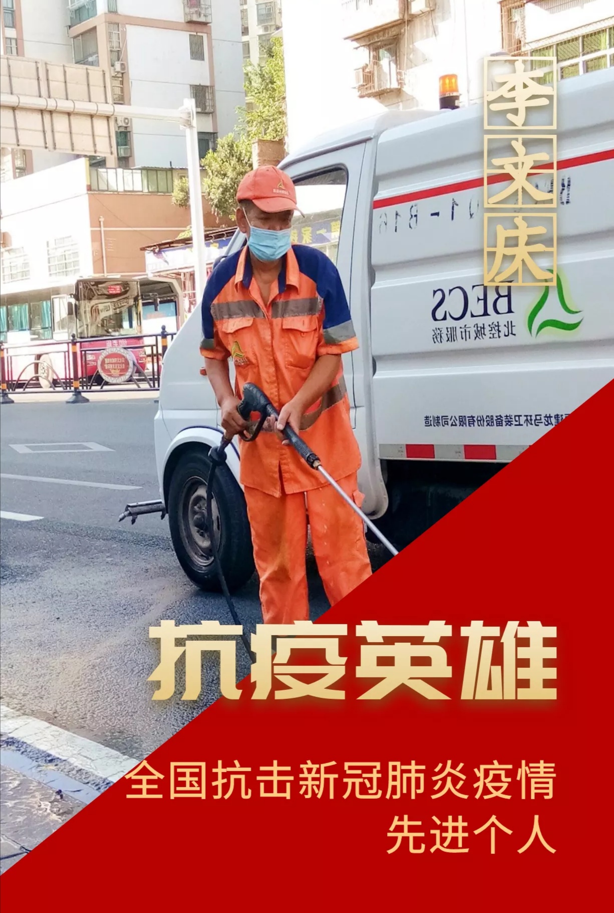 我司二片区环卫工人李文庆同志荣获全国抗击新冠肺炎疫情先进个人荣誉。
