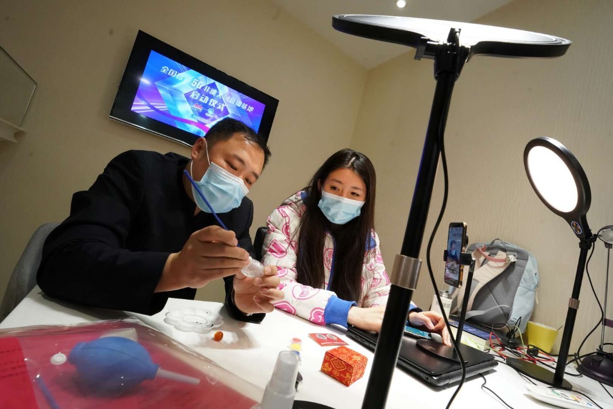 12月21日,全国首家5G非遗文创直播基地在北京红桥市场落户启动。该基地助力红桥市场的传统特色,通过搭载数字化互联网直播平台,联手打造一个以非遗文创、珍珠文化为主题的网络直播基地,聚合优质网络技术资源等新手段为非遗文创产业发展注入新的活力。京梳子技艺传承人董良、内画鼻烟壶工艺美术大师刘东和国家级雕漆制作技艺传承人李志刚,三位大师正在通过直播各自展示技艺。