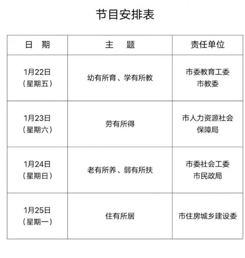 本次节目以“不断实现人民对美好生活的向往”为主题,围绕幼有所育、学有所教、劳有所得、老有所养、弱有所扶、住有所居等民生话题,聚焦群众关注的热点难点问题,邀请市委教育工委市教委、市委社会工委市民政局、市人力资源社会保障局、市住房城乡建设委四部门“一把手”与广大市民沟通对话。