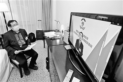 昨日,市政协十三届四次会议首场大会发言以网络直播的形式开展,政协委员们分别通过市政协履职APP在线直播模块、住地房间闭路电视同步收看本次大会发言摄影/本报记者 魏彤