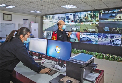 1月28日12时20分,张卫宇站在视频监控屏幕前,手拿步话机与前方民警保持联系。