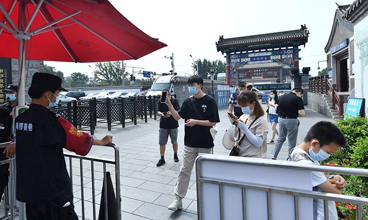 日前,北京232场疫情防控新闻发布会上,北京市文化和旅游局一级巡视员周卫民介绍,首都文化和旅游行业需严格执行防控管理措施:落实“限量、预约、错峰”要求,公园、景区、名胜古迹按日最大承载量的60%限流开放,同时合理控制外埠来京人员预约量。 8月7日是周末,新京报记者对南锣鼓巷景区进行了走访。图为:南锣鼓巷南口,游客扫码后再进入安检通道。南锣鼓巷南口、北口都已增加了安保力量,动态监控街区客流密度。