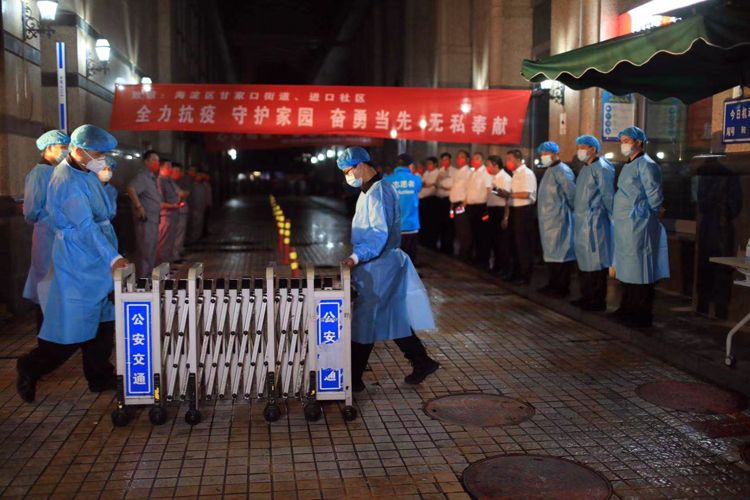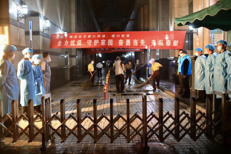 8月19日23时许,北京海淀区甘家口街道进口社区国兴家园西门,工作人员清扫通道,迎接解封。据北京海淀官方微信号消息,8月19日,海淀区国兴家园小区开展第七轮核酸检测,结果均为阴性,小区环境采集样本均为阴性,经市、区疾控部门综合研判决定,8月20日零时,国兴家园小区解除封控管理。至此,受本轮疫情影响的海淀全区封控管理场所清零。