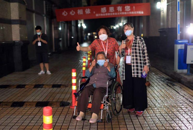 8月20日零时后,国兴家园,一位坐着轮椅的老人出小区散步,举起双手“点赞”。
