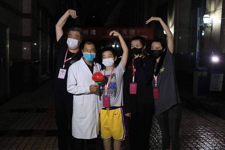 8月20日零时后,国兴家园,居民在小区出口处摆出爱心手势拍照。除了在国兴家园内居家隔离的居民正式解封外,在集中隔离医学观察点进行医学观察的两百余名居民也将分两批由街道统一派车接返回家。