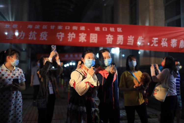 8月19日23时许,北京昌平区龙泽园街道龙跃苑二区,工作人员守候大门口等待解封时刻。7月28日0时至24时,北京新增2例京外关联本地新冠肺炎确诊病例,昌平连夜封控管理确诊病例居住的龙泽园街道龙跃苑二区及周边9个小区,涉及4.1万人。8月12日零时除龙跃苑二区以外,昌平9个小区解除封控管理。龙跃苑二区8月19日完成第七轮核酸检测后,于20日零时解封。