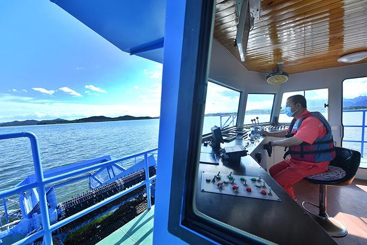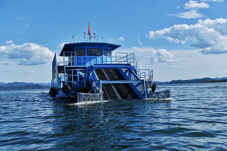 水库虽美,但是工作人员经年累月地漂在水面上不是件轻松的活儿,侯占东的面庞、胳膊早已被晒得黑黝黝。水上漂浮物一般由巡查船只发现,如果漂浮物比较多,侯占东就开着船驶过去,启动打捞按钮,漂浮物随着船上的履带传送上来,集中在集纳区域,由工作人员集中处理。