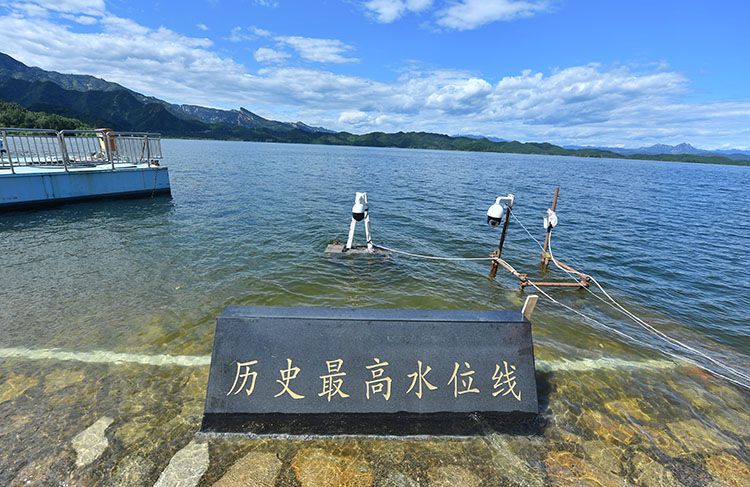 在水库库边,微风吹起的涟漪缓缓冲向刻有“历史最高水位线”的石碑,这里记载着密云水库此前蓄水量的最好“成绩”:1994年9月16日,密云水库历史最高水位153.98米。石碑下方是一条白色的水位线,8月23日,水库水位超过这条水位线。