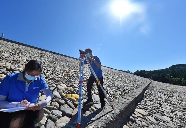 8月26日,监测人员在九松山副坝上进行作业。