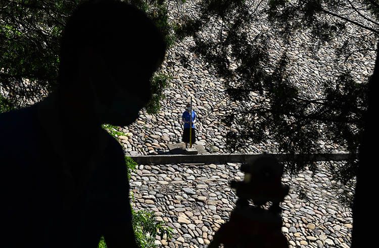 8月26日,密云水库九松山副坝坝底路面坑洼不平,监测人员扛着监测设备,开始了一天的工作。