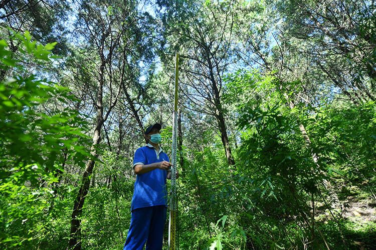 8月26日,密云水库九松山副坝密林中,监测人员在固定点位立起标尺。