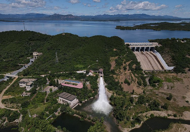 8月26日,航拍密云水库大坝。在确保水库安全的基础上,密云水库尽量把水存了起来。