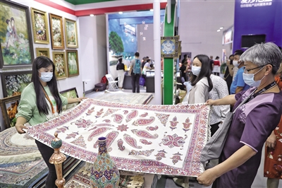 9月7日,服贸会国家会议中心伊朗展区,市民正在挑选桌垫。新京报记者 王飞 摄