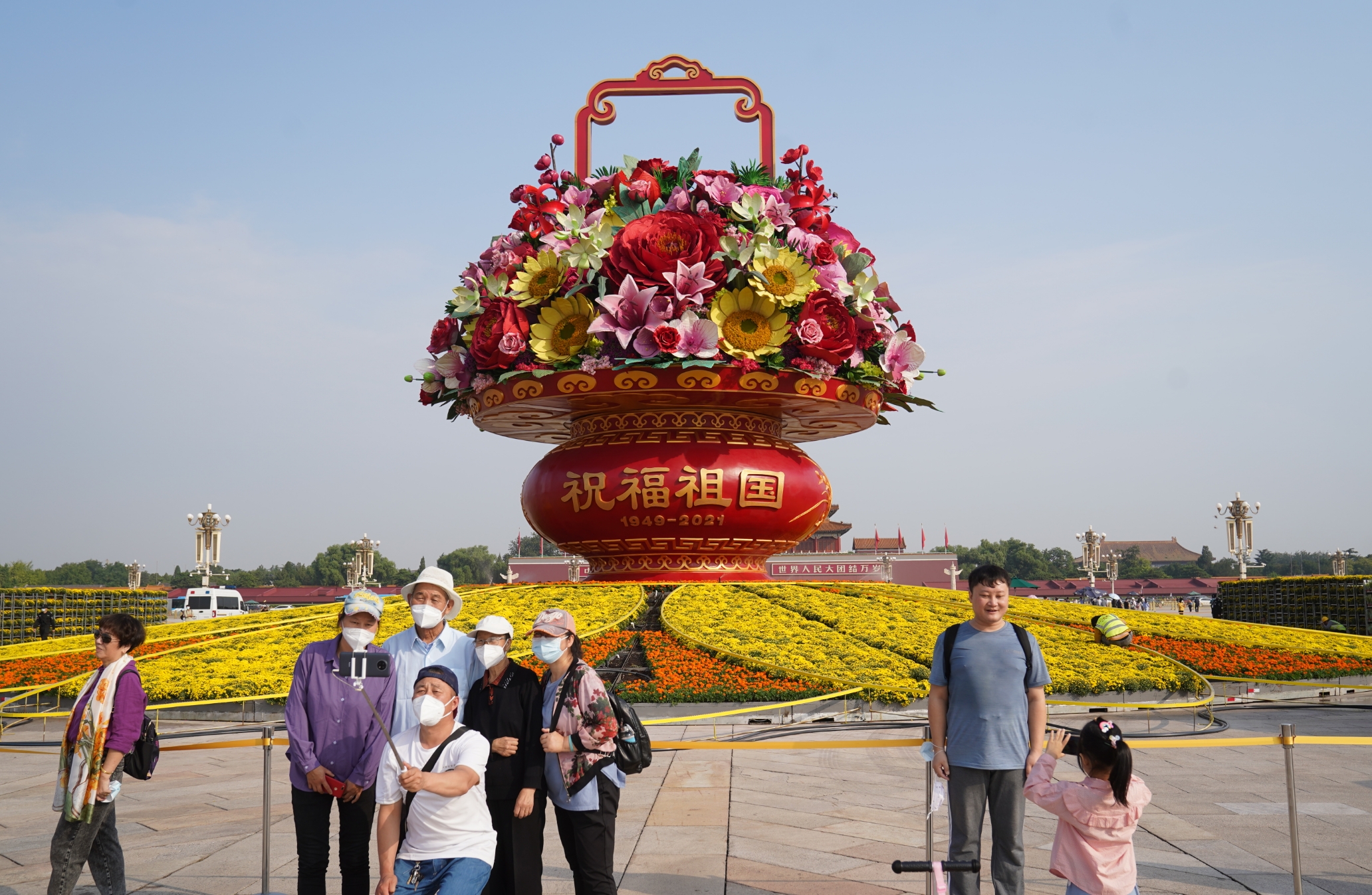 今天(23日)清晨,路过天安门广场的市民惊喜地发现,“祝福祖国”大花篮亮相了。一夜之间,顶高18米的花篮完成吊装。
