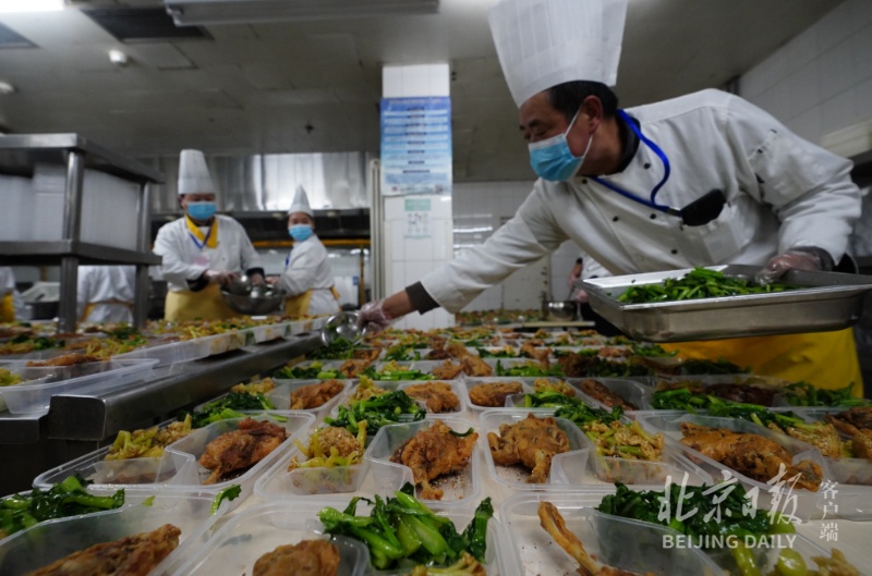 餐厅里工作人员忙着分装餐食、装盒、配发水果和酸奶,每餐四个菜、荤素搭配,顿顿不重样。