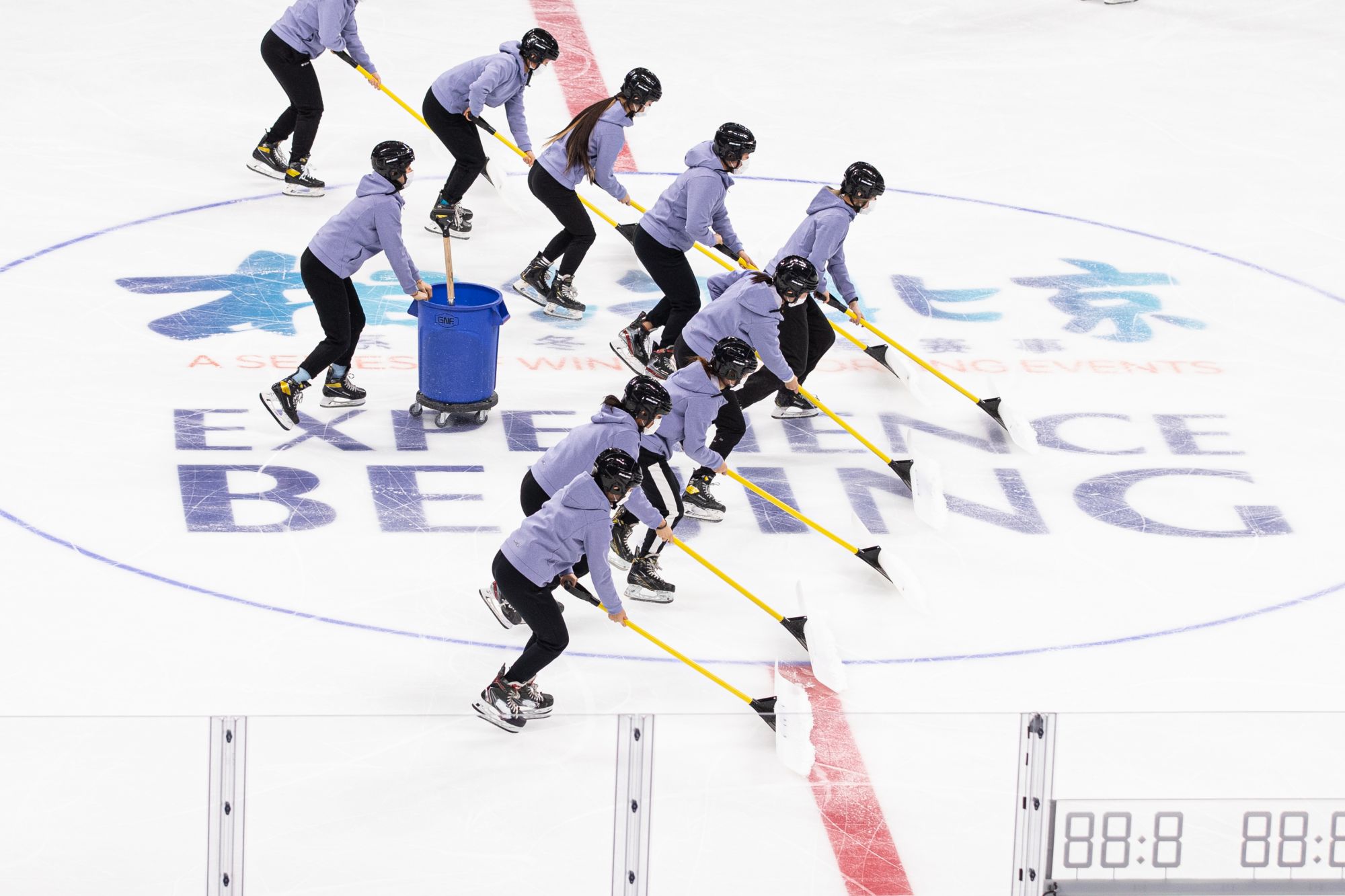 11月9日,志愿者在五棵松体育中心举行的“相约北京”冰球国内测试活动比赛间隙清冰。新华社记者吴壮摄
