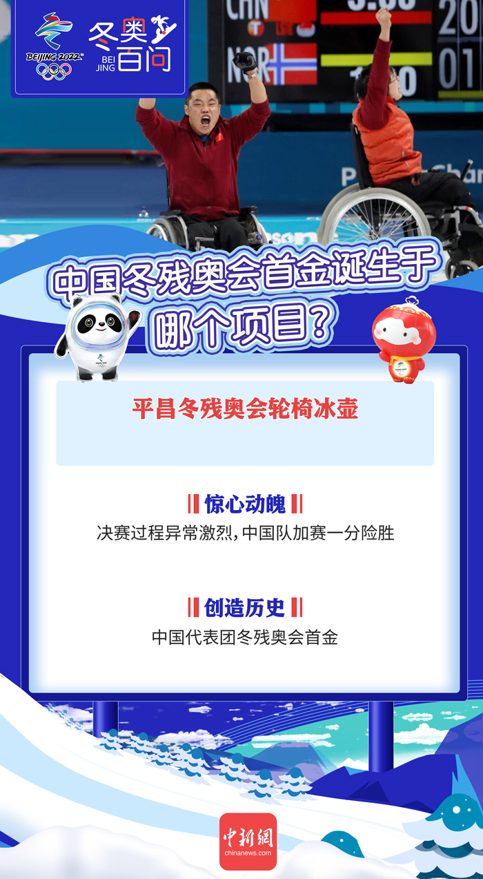 在2018年平昌冬残奥会轮椅冰壶决赛中,中国队历经加时以6:5险胜劲旅挪威队,从而登上最高领奖台。这是中国代表团在所参加的历届冬季残奥会上斩获的首枚奖牌,也是首枚金牌,完成了从无到有的突破。