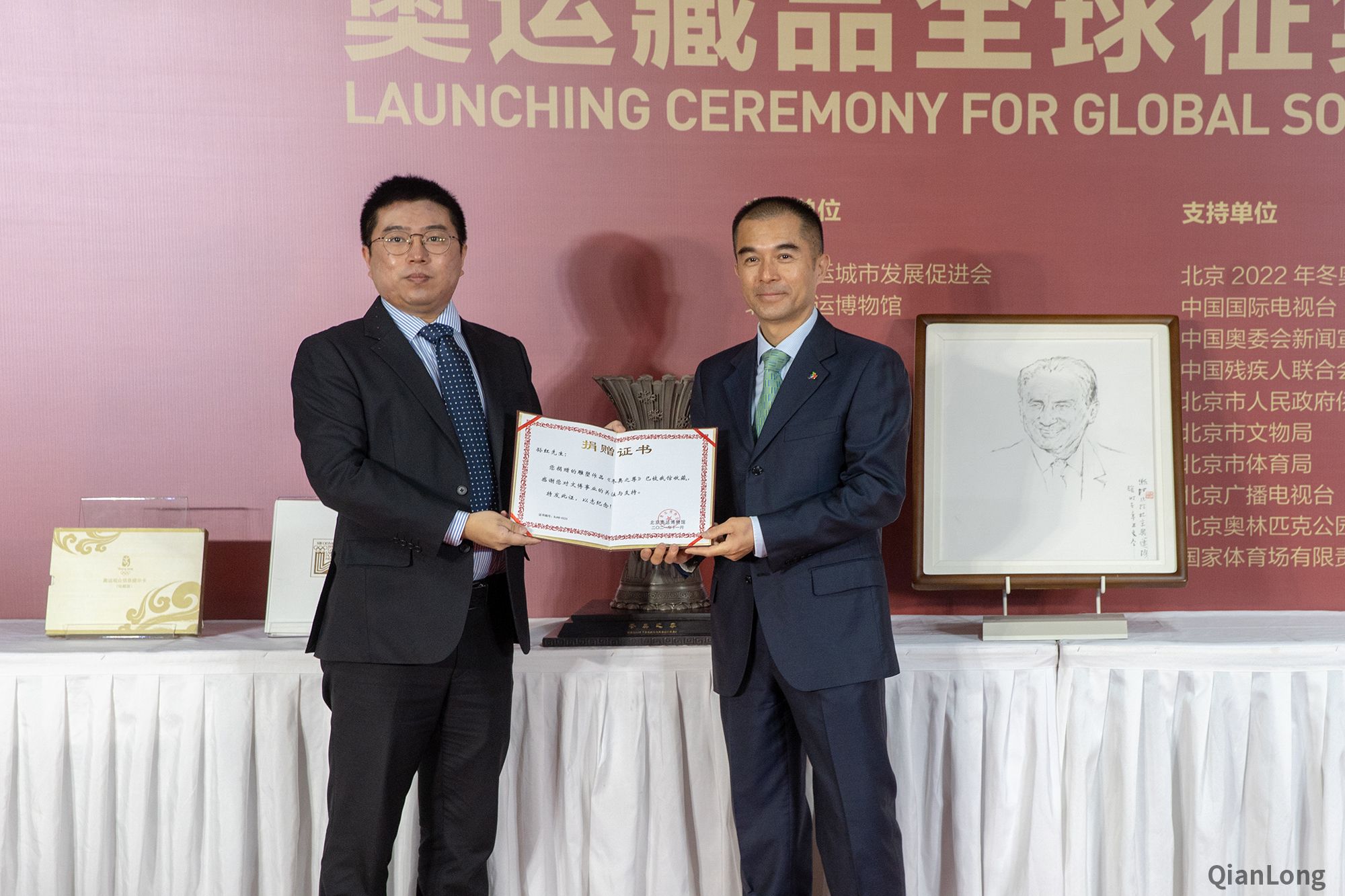 启动仪式现场,联合国首授环保艺术大师、著名艺术家袁熙坤捐赠了水墨肖像作品《罗格主席画像》,国家民族画院副院长、北京市文史研究馆馆员郑山麓捐赠了国画作品《双奥北京盛景图》,国家一级美术师、北京2008年奥运会“奥运盛鼎”设计师孙红捐赠了雕塑作品《冬奥之尊》,中国工艺美术大师、国家级非遗项目(苏绣)代表性传承人姚建萍捐赠了奥运国礼《仕女蹴鞠图》,中国体育集邮与收藏协会常务副主席侯琨捐赠了《1980年普莱西德湖冬奥会官方总结报告》。