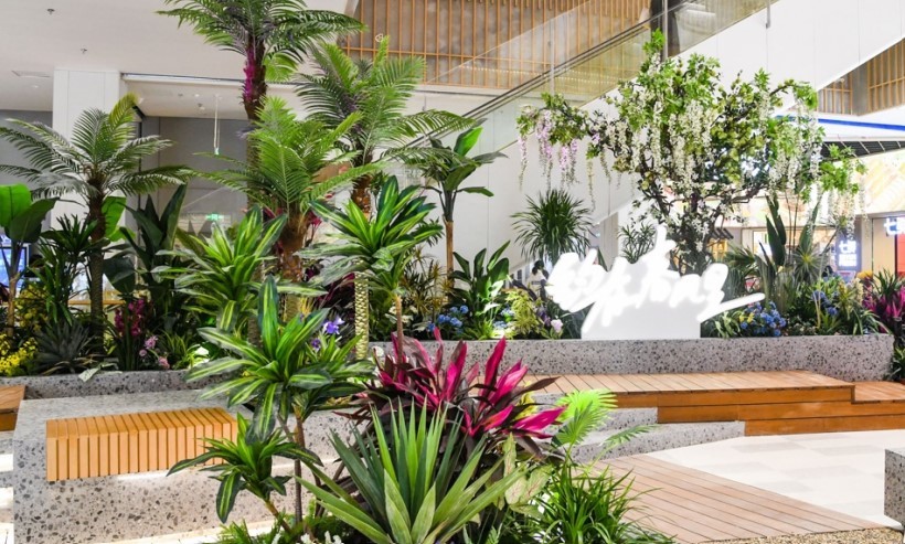 丰台大悦春风里集合了大型风动幕墙、双首层设计、樱花大道、多层退台花园等空间设计,处处还原生活美意,在室内空间氛围打造上以大量绿植作为装饰,将自然与商业交织,打造了空中连廊系统,以灵活的商业动线将多元业态进行连接。