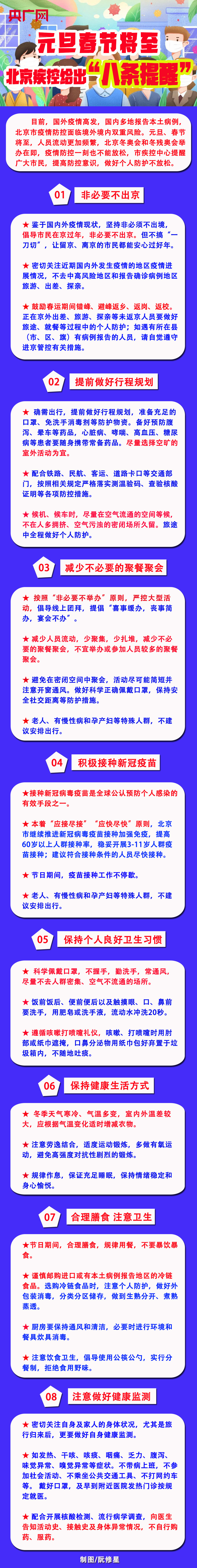 央广网北京12月28日消息(记者 阮修星)12月28日,北京市疾病预防控制中心发布元旦、春节健康提示称,目前,国外疫情高发,国内多地报告本土病例,北京市疫情防控面临境外境内双重风险。元旦、春节将至,人员流动更加频繁,北京冬奥会和冬残奥会举办在即,疫情防控一刻也不能放松,广大市民要提高防控意识,做好个人防护不放松。