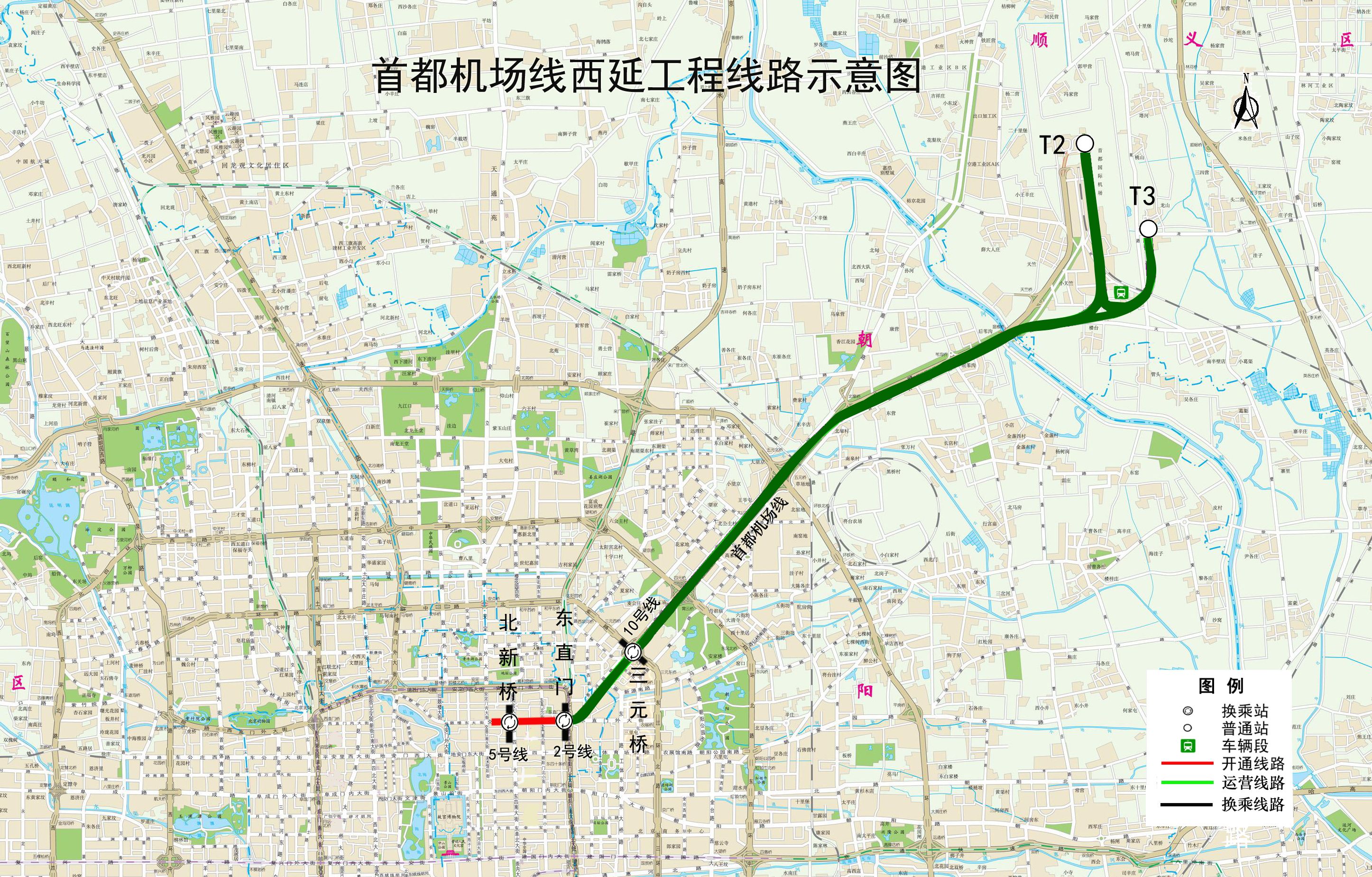 首都机场线西延工程线路全长1.8公里,起点位于既有首都机场线东直门站,沿东直门内大街向西敷设,终点至北新桥站。新建的北新桥站可与地铁5号线实现换乘,将有效加强首都机场线与轨道交通线网联系,提升首都机场线的整体系统运营能力。