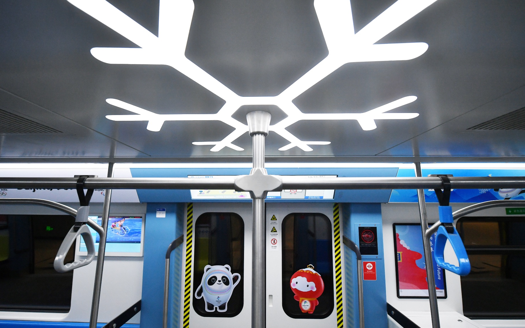 车厢的灯光设计成雪花形状,车门上,冬奥会吉祥物“冰墩墩”“雪容融”向乘客们招手。新京报记者 王贵彬 摄