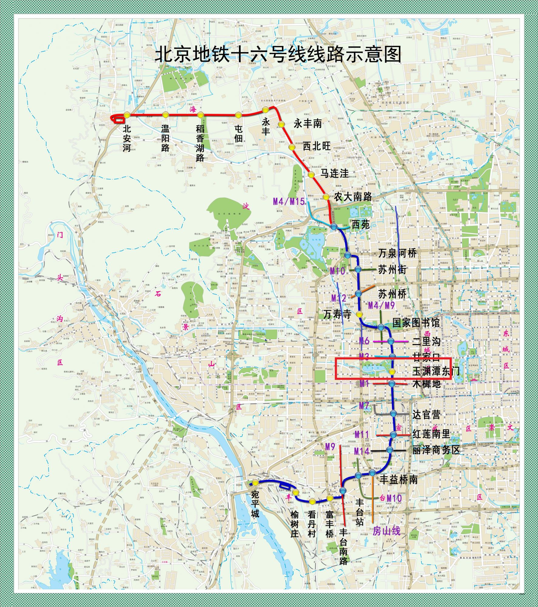 16号线中段(玉渊潭东门站)全长约1公里,从甘家口站至玉渊潭东门站,可服务月坛南街附近的单位、居民出行。同时,它还将进一步提高16号线南北向重要干线的作用,推动和促进北京南北城区的发展。