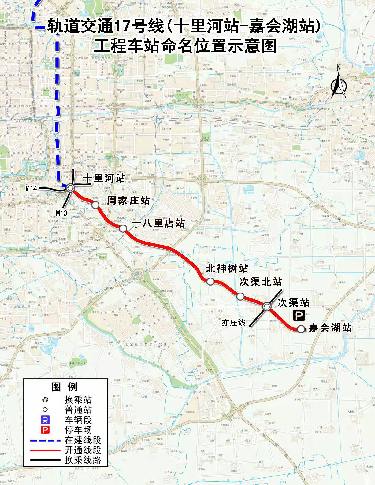 17号线是一条全新的地铁线路,此次开通的17号线南段,全长16.5公里,共设车站7座,自南向北分别为嘉会湖站、次渠站、次渠北站、北神树站、十八里店站、周家庄站、十里河站。