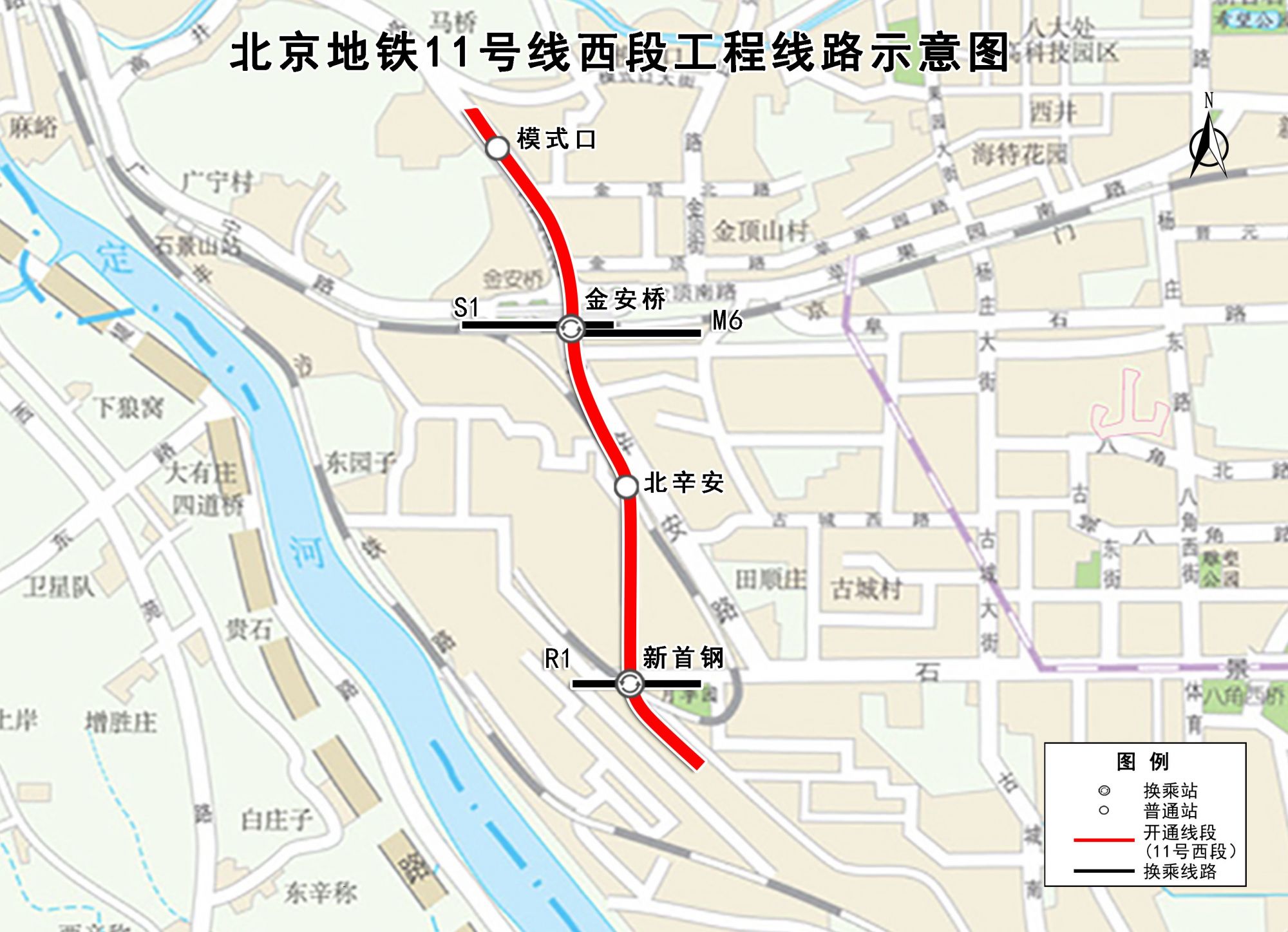 北京地铁11号线西段(冬奥支线)线路共设新首钢站、北辛安站、金安桥站、模式口站(暂缓开通)4座车站,全长约4.2km。开通后直接接通冬奥首钢赛区,设置新首钢站,在金安桥站还实现了三线换乘。