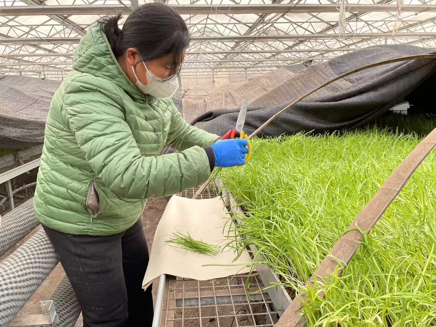 青韭在老北京人心目中是冬季市场的高端菜,价格远超猪肉,属于蔬菜市场妥妥的“尖货”。在大兴区礼贤镇的田园鑫盛蔬菜园,记者见到了刚刚试种成功的青韭,还没来得及掀开遮阳布见到它们的真面目,辛香浓郁的韭菜味已经扑鼻而来。青韭的韭叶翠绿鲜嫩,品相香气都十分诱人。