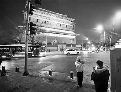 昨日17时30分,在漫天纷飞的雪花中,鼓楼一层一层渐次亮了起来,黄、红、绿,层次分明、热烈。而与之遥遥相望的钟楼也有白光映射,一个“浓妆”一个“淡抹”交相辉映。同时,北中轴线上的地安门内外大街也跟着亮了起来,吸引了不少市民纷纷拍照。登上鼓楼,地安门外大街各商铺外立面上、挂檐板上、砖墙上新装的瓦楞灯、线条灯、投光灯等也一齐亮了起来,中轴线的空间秩序一览无余。