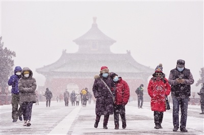 大寒节气迎降雪,整个北京城银装素裹,十分应景,也给即将到来的北京冬奥会增添了不少“冰雪”氛围。