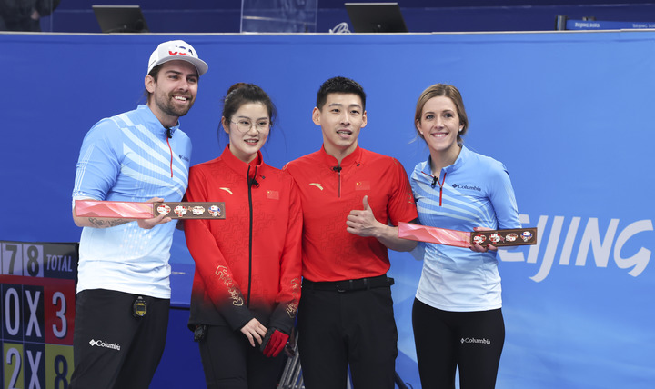 在2月5日比赛中,中国冰壶混双组合凌智和范苏圆不敌美国组合维多利亚·珀辛格和克里斯托弗·普利斯。赛后,凌智和范苏圆向对方赠送“冰墩墩”奥运纪念徽章。美国选手惊喜接过礼物。四人合影留念。