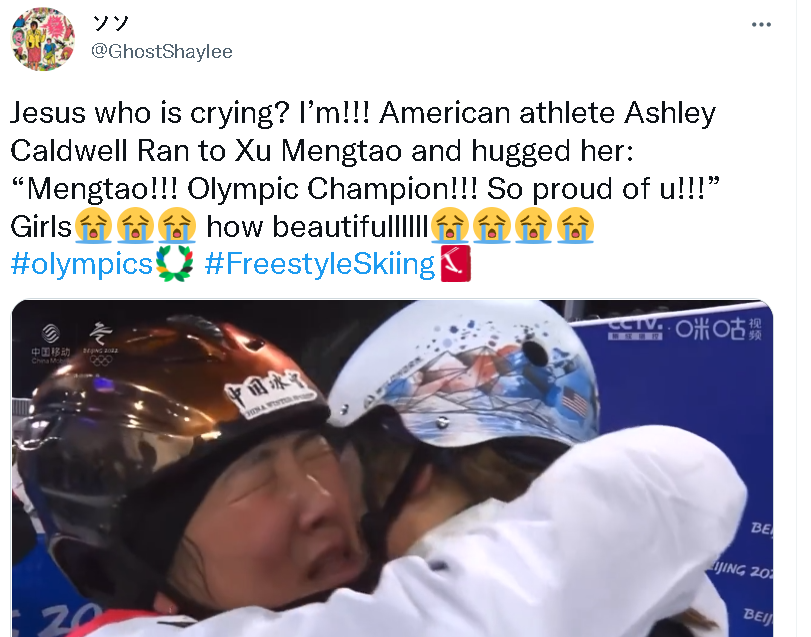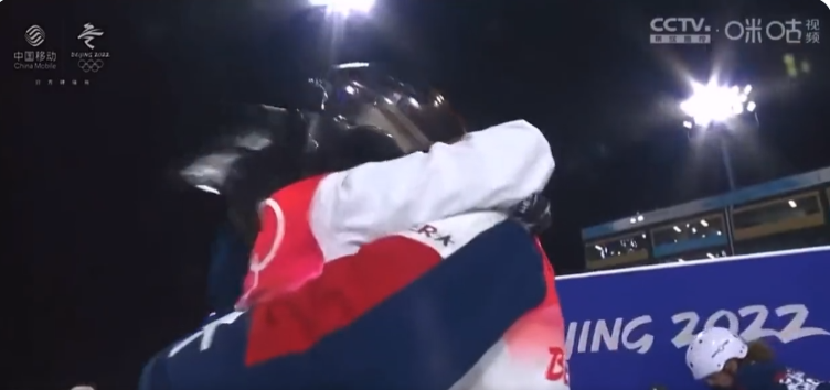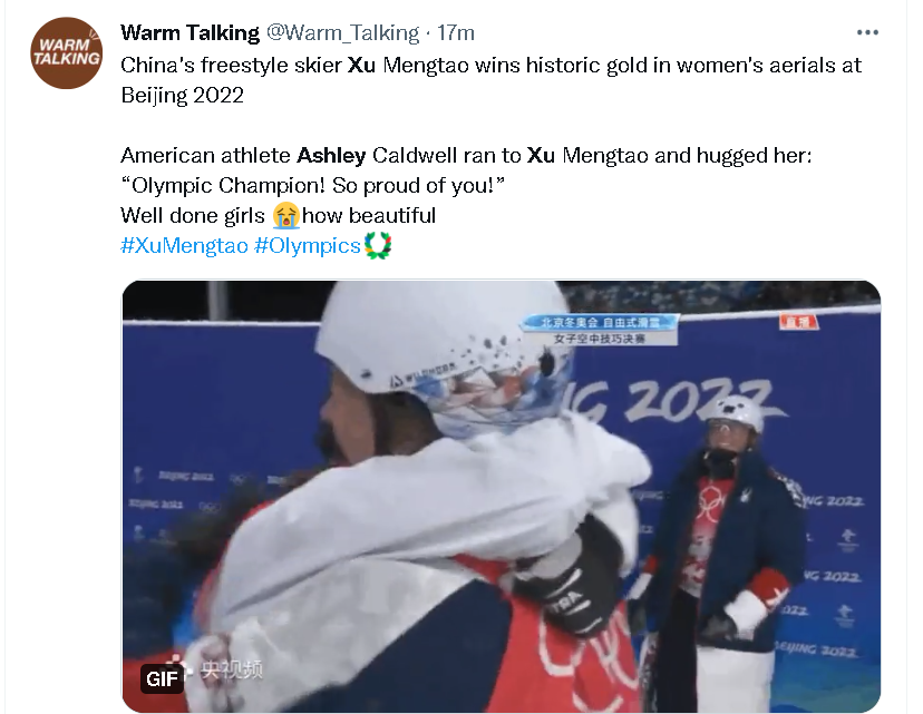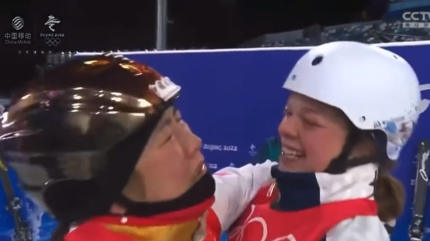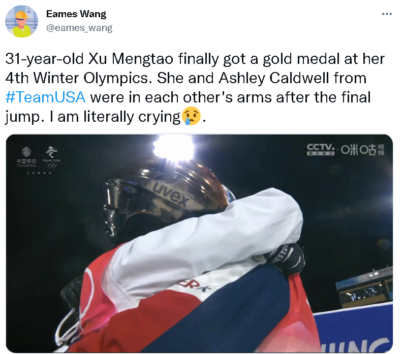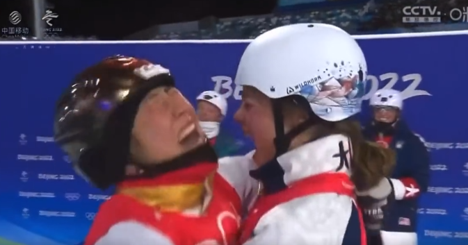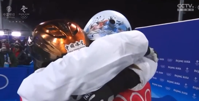 不过,就在许多人为这位已经拼搏了4届奥运会终于实现了自己体育梦想的32岁女运动员而欢呼时,不少来自中国以及外国的网民,还被徐梦桃与美国选手阿什利·考德威尔(Ashley Caldwell)在赛后的一个动作所深深感动了。