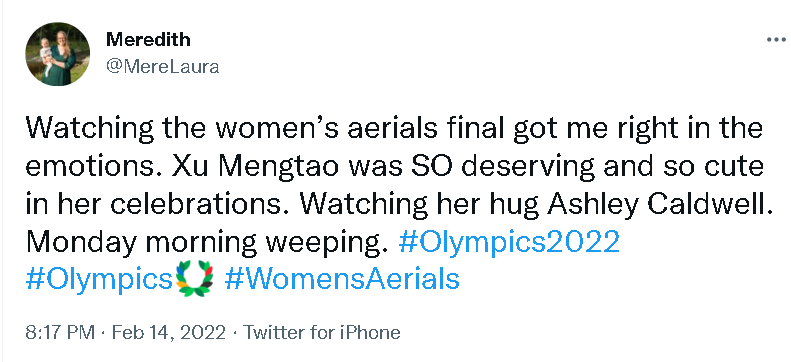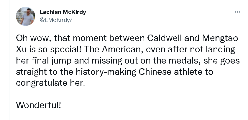 一位澳大利亚体育新闻网站的制作人亦表示,考德威尔和徐梦桃拥抱的那个瞬间太“特别”了,而且即便考德威尔最后一跳在落地时出现失误,没有获得奖牌,她仍然想着去祝贺创造历史的中国运动员。
