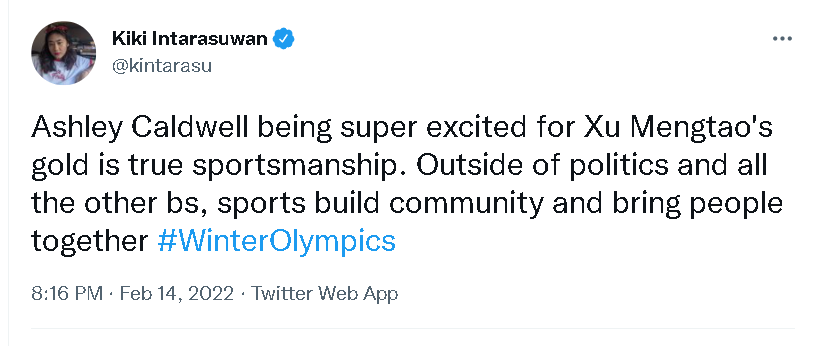 一位就职于美国NBC新闻网的美籍亚裔记者就在境外社交网站“推特”上表示,考德威尔为徐梦桃激动庆祝的场景是真正的体育精神的展现。她还表示体育才能让人们走到一起,而不是政治和其他的东西。