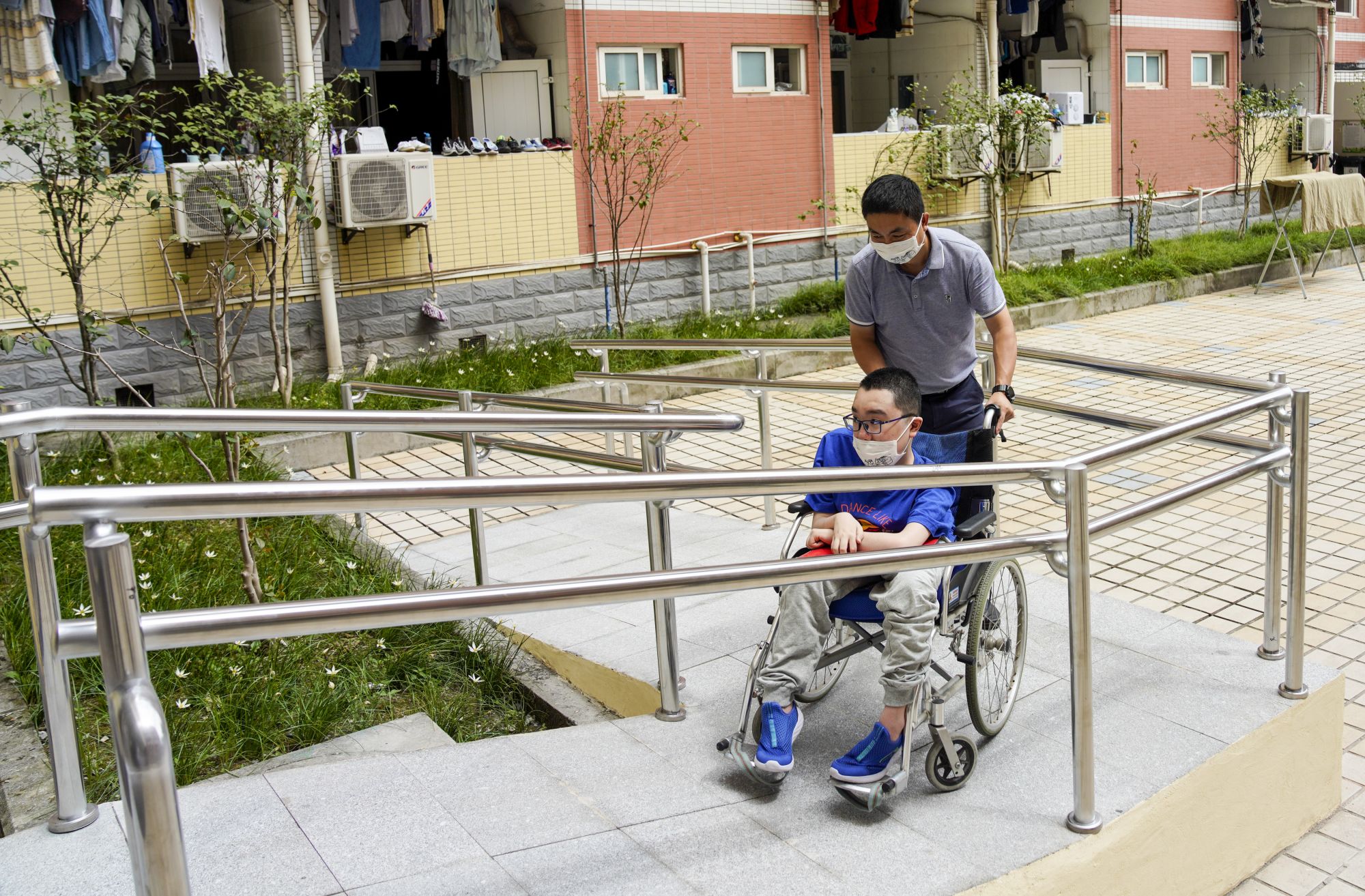 2021年9月8日,一位残疾学生坐轮椅通过西南政法大学宿舍区无障碍通道。新华社记者 刘潺 摄